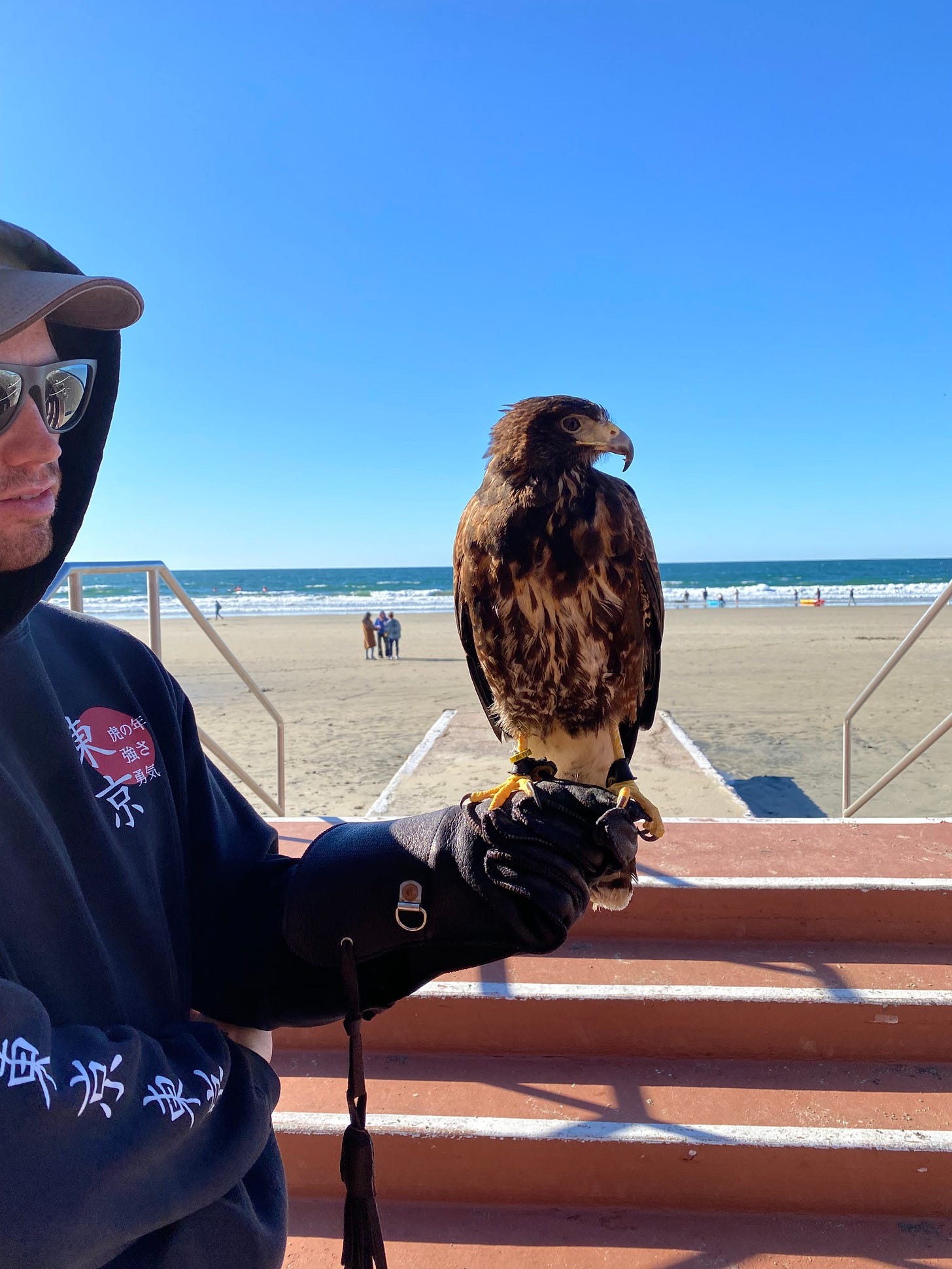 He introduced us to his Harris Hawk who sits on his hand as he patrols the beach, letting him loose when seagulls begin to gather around people.