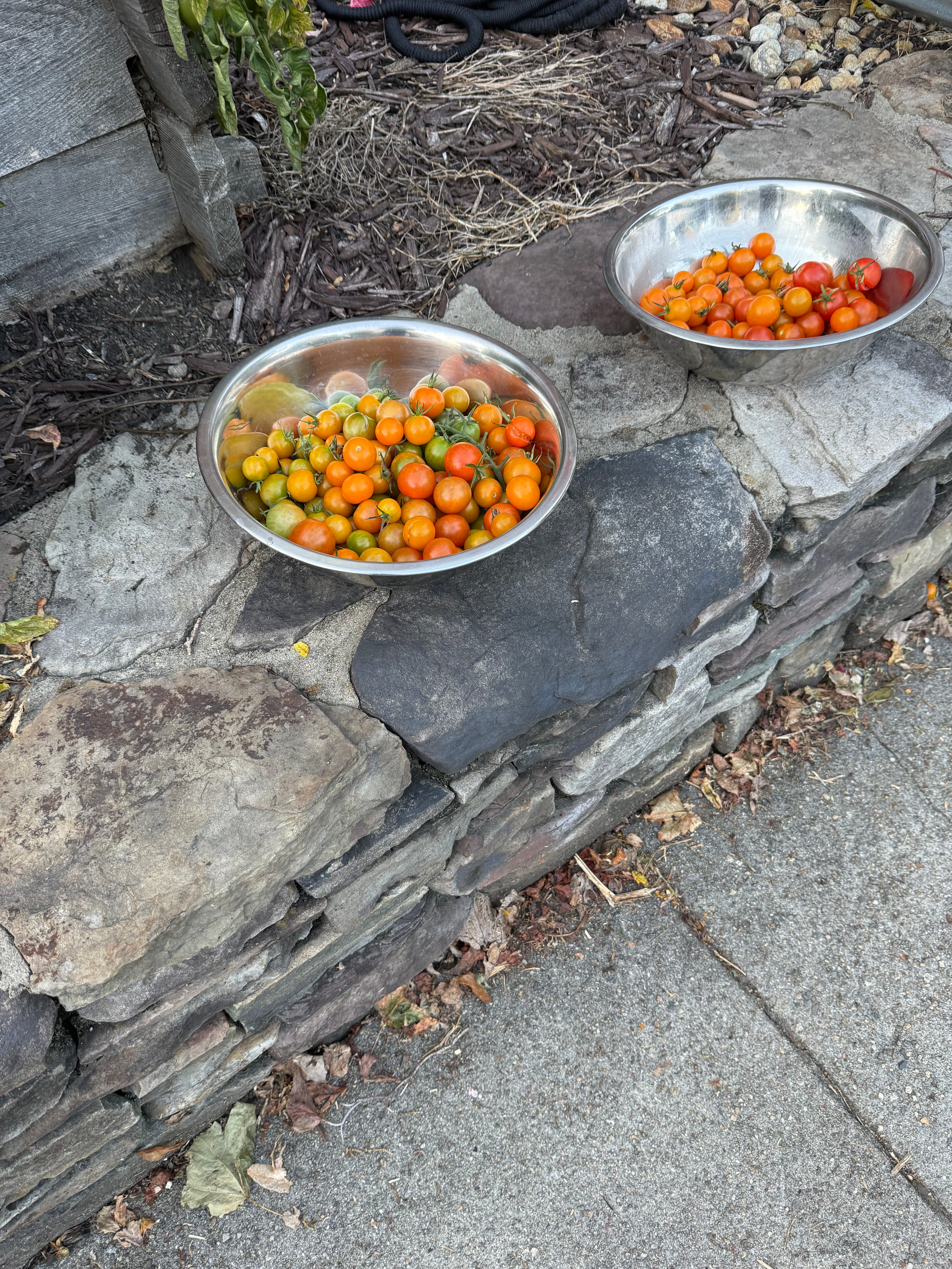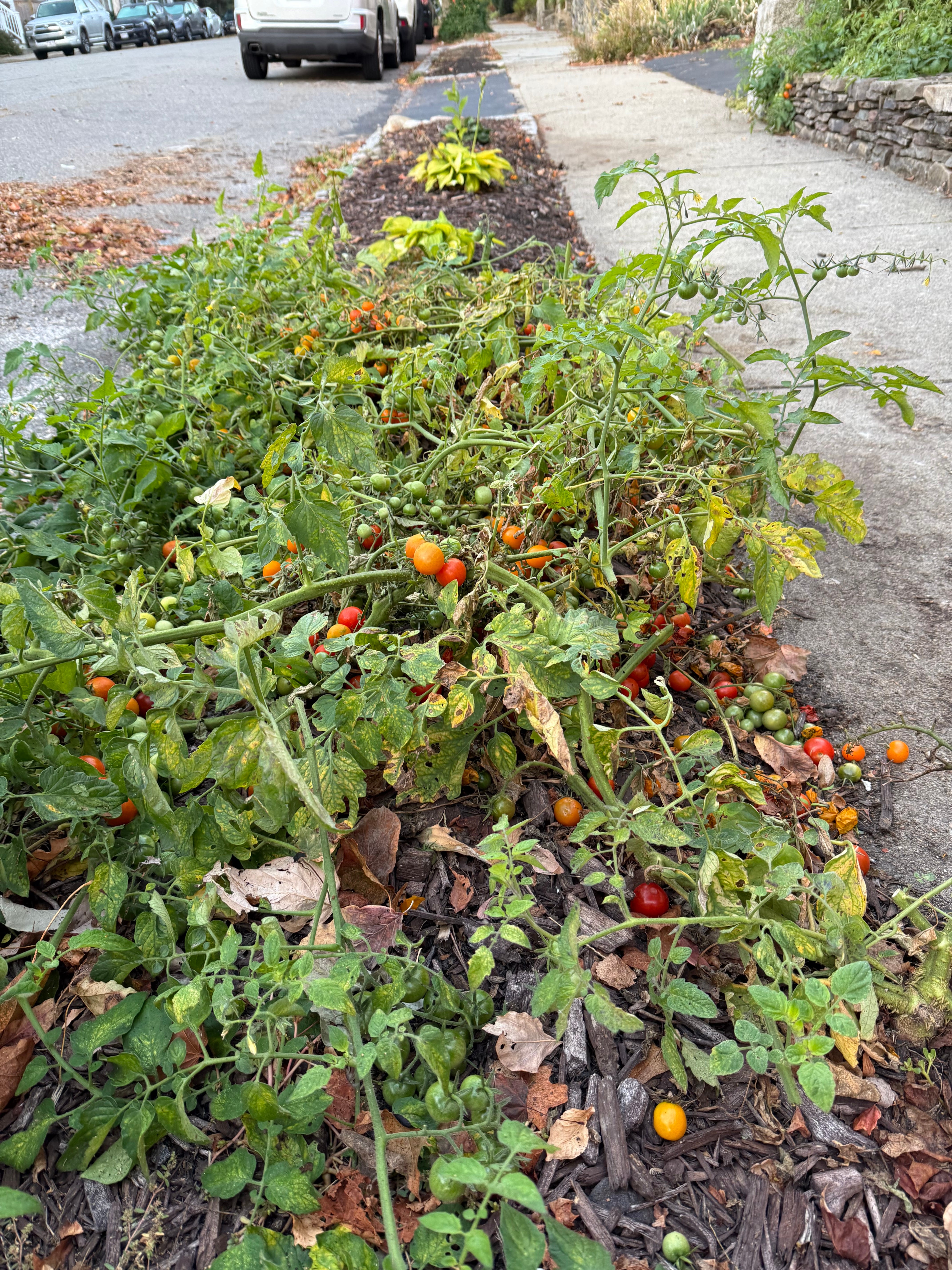Our down the street neighbors had an extravagant tomato harvest this year. Their garden, planted in the front yard, couldn’t contain it, and it overflowed onto the sidewalk.