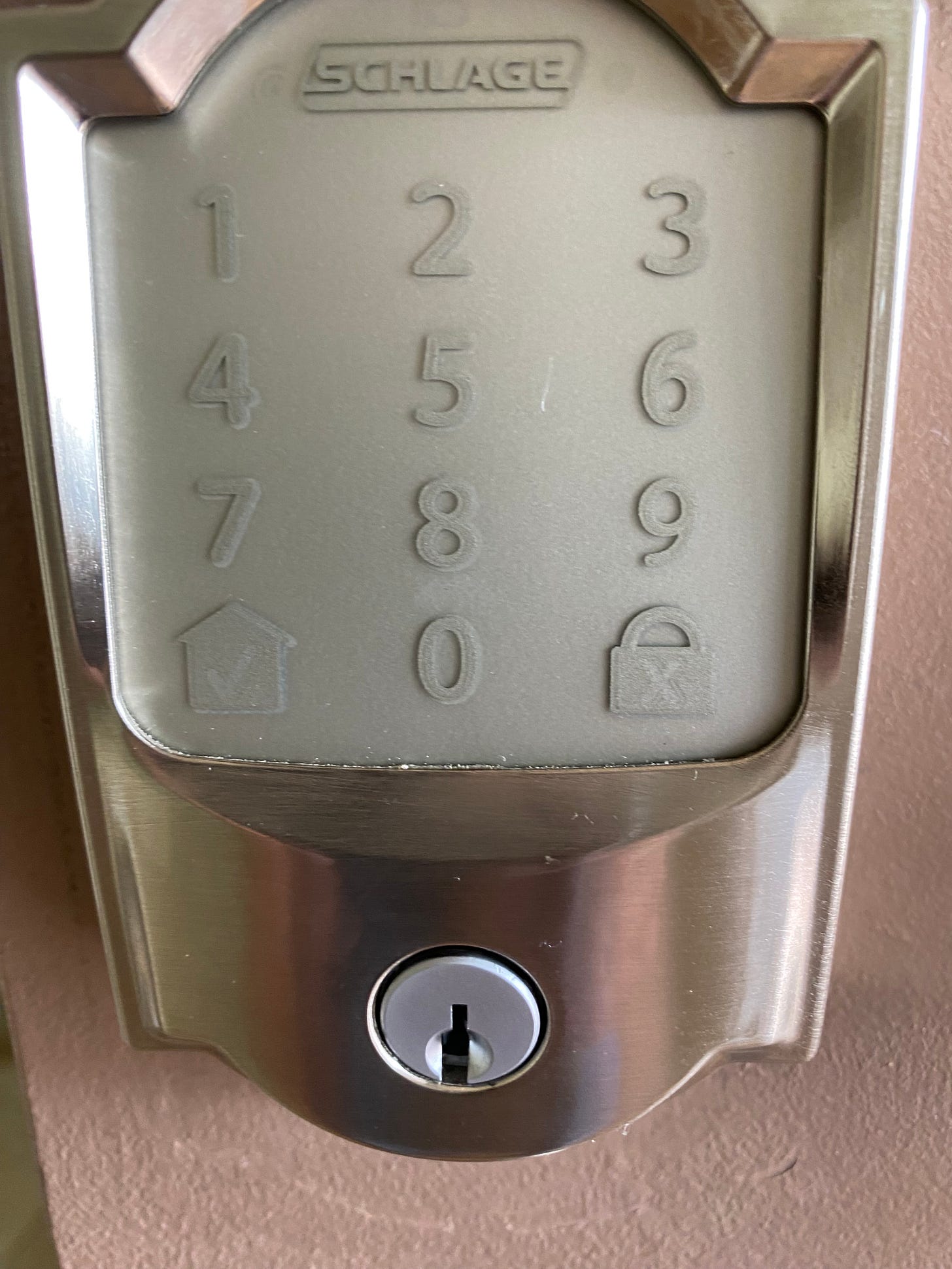 Gabe, our teenage grandson, was visiting, I told him the code once. When we were leaving one morning I asked him if he had entered the code to lock. “No,” he said. “But you have to,” I insisted. “No you don’t,” he said, “all you have to do is press that padlock image in the lower right.”