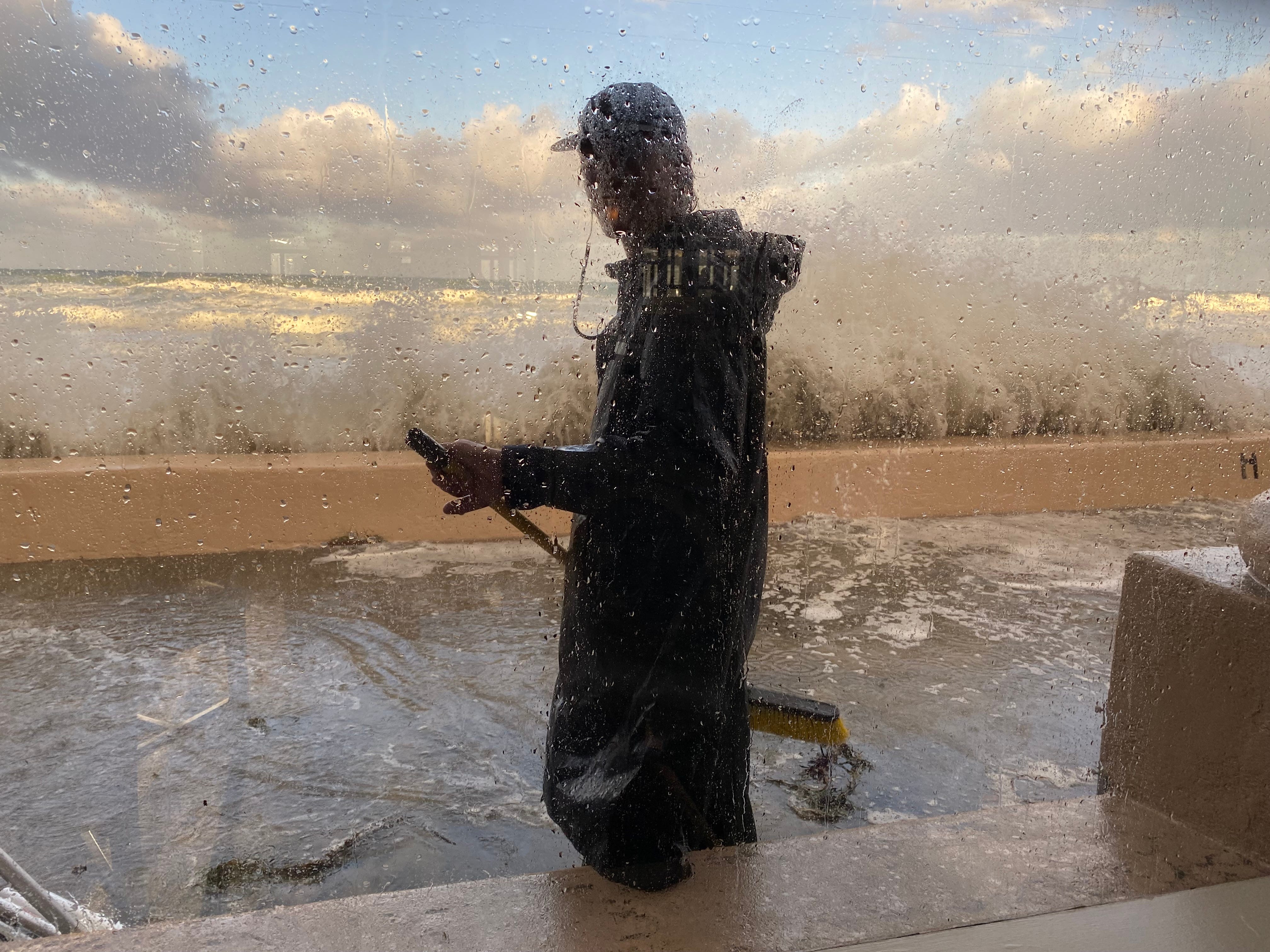 Meanwhile, people who had been struggling with the water since dawn, continued sweeping the tidal water from the esplanade. Even though it was clear they couldn’t stay ahead of the swells, they continued sweeping.