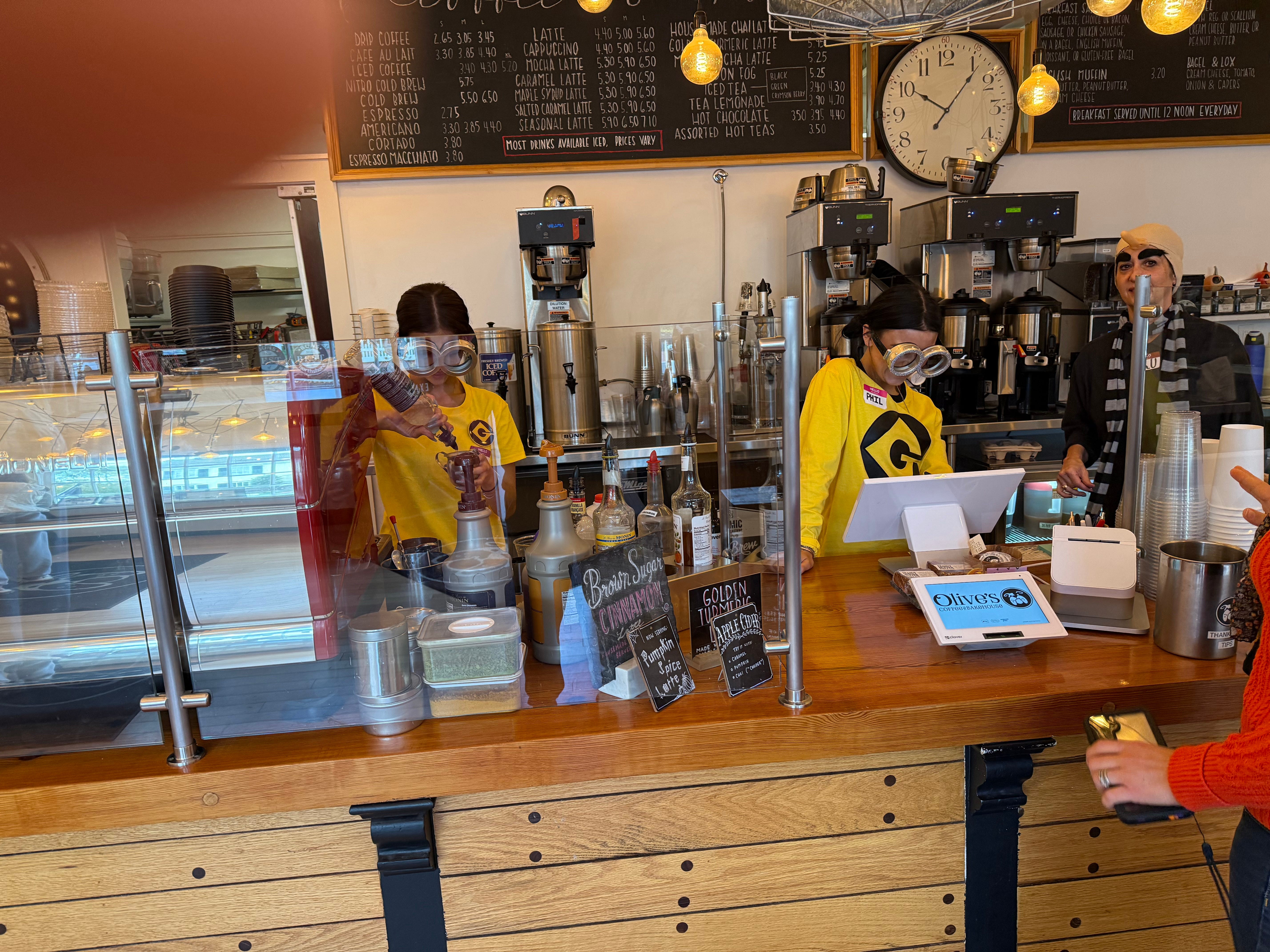 As you can see, they have fun. Which is a part of what I pay for, the good spirit. In these mostly grim days, a shot, not merely of extra hot, extra chocolate mocha, but of young seemingly happy women, is worth a lot.